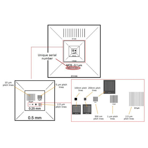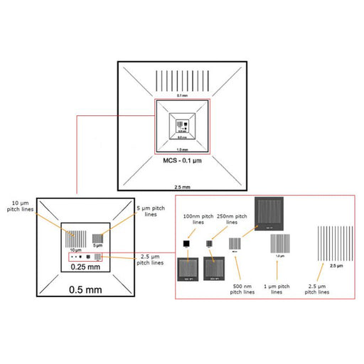 ideal SEM calibration standard with 2.5mm to 1 µm or 100nm patterns
